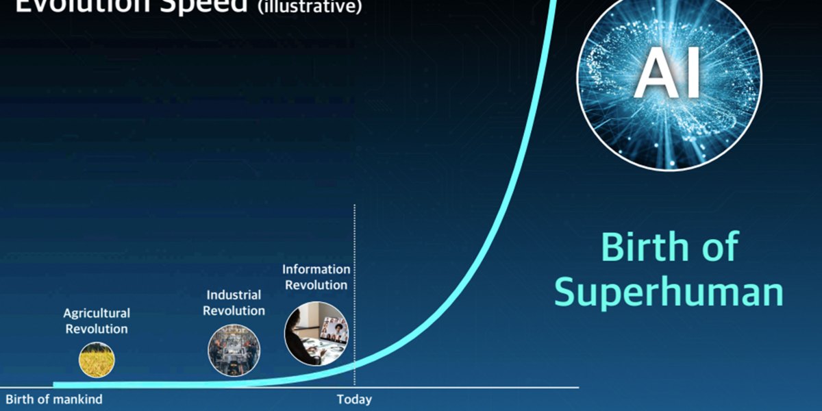 At the meeting, Son presented slides of “Evolution Speed (illustrative)” that depicted a graph of human evolution. From the birth of mankind to the agricultural revolution, the line is completely flat. Then, from the Industrial Revolution to the Information Revolution, the line creeps up a measly centimeter (that’s where we are today). But then, a few years into his projected future, the line shoots up, its slope craning toward a near vertical line. The cause? “AI: Birth of Superhuman,” the slide reads.